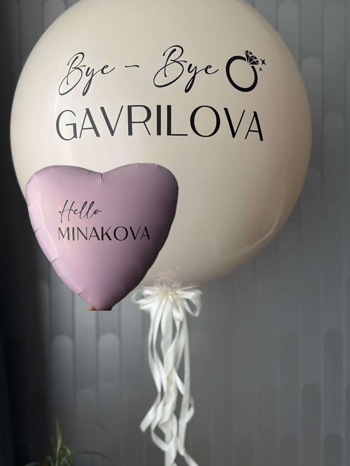 Наш большой праздничный шар — это яркое шоу, которое запомнится надолго. Внешний шар украшен элегантно и стильно — на нём гордо написана старая фамилия невесты. В самый волнительный момент он лопается… и изнутри появляется сердце с новой фамилией!